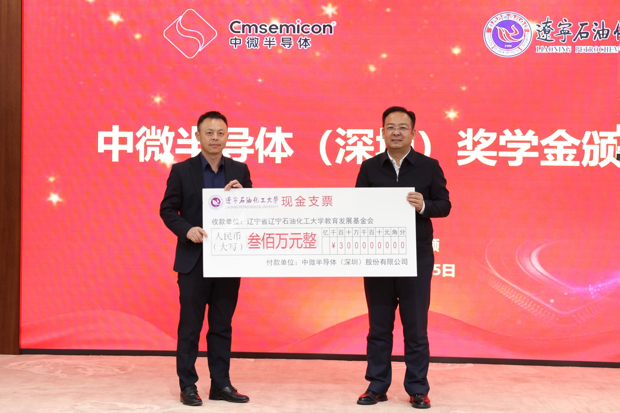 仪式上,杨勇向辽宁省辽宁石油化工大学教育发展基金会捐赠人民币300万元。霍庆生代表学校接受了捐赠,并向杨勇校友回赠了捐赠证书。王强宣读了关于对2025年度中微半导体(深圳)奖学金获得者表彰的决定。